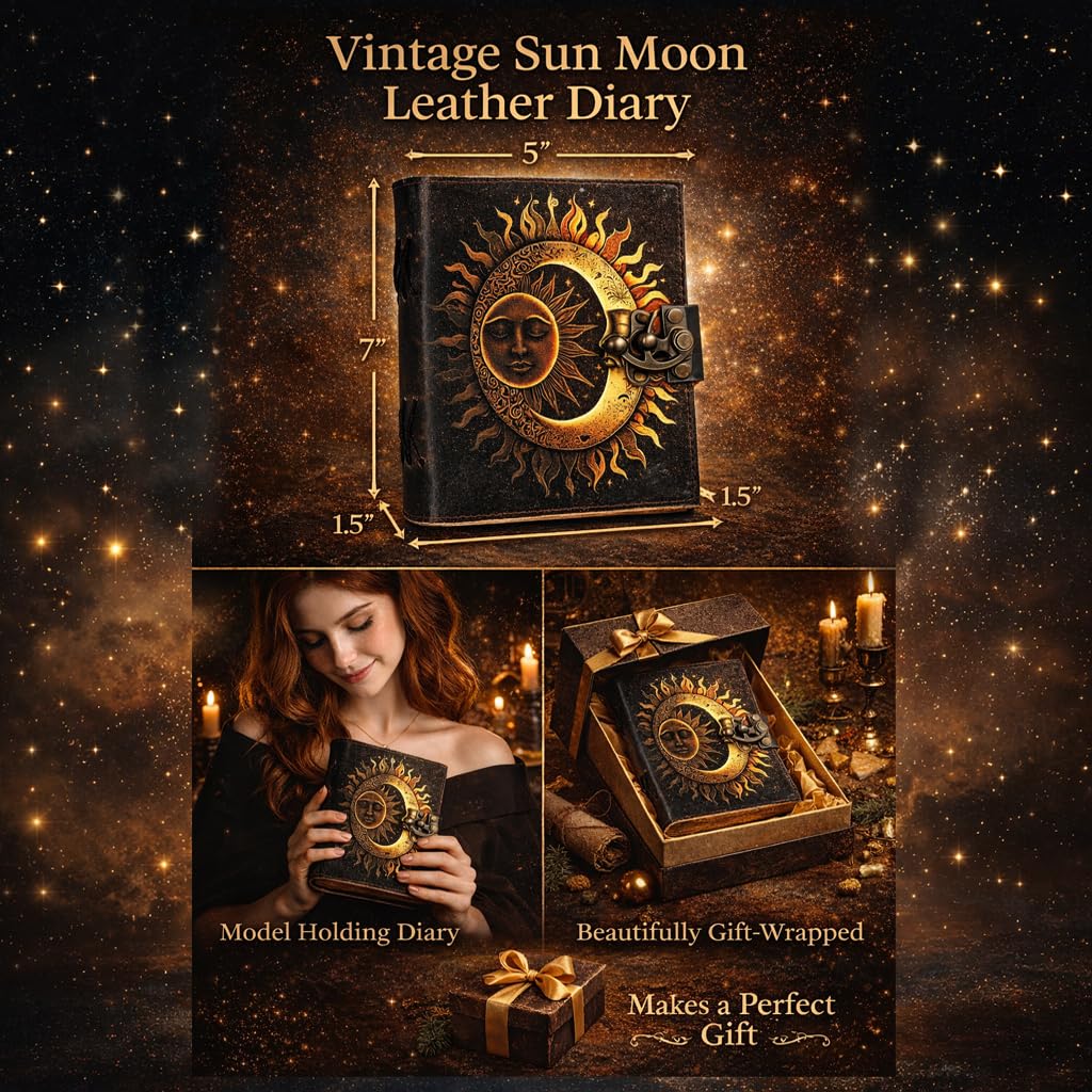 cuero Handcrafted Sun & Moon Leather Journal with Lock – Vintage Leather Diary, 200 Pages Antique Paper Notebook, Aesthetic Writing Journal Gift for Women & Men (7 x 5)—